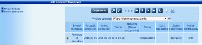 W oknie dostępne są pozycje Procesy trwające i Procesy zakończone, które wyświetlają listę sprawozdań ograniczoną do sprawozdań kontroli przypisanych użytkownikowi. W ramach menu Procesy trwające na liście sprawozdań dostępne są tylko sprawozdania kontroli o statusie nieuzupełnione i nieprzekazane, natomiast w ramach menu Procesy zakończone wyświetlana jest lista sprawozdań, które zostały przekazane. Na listach tych widoczne są tylko sprawozdania sporządzane w oparciu o formularze dowiązane (samokontroli), które zostały skierowane do uzupełnienia przez jednostkę użytkownika. Uwaga! Użytkownik jednostki (kontrolowanej) nie może uzupełnić sprawozdań na formularzach dowiązanych (samokontroli), jeżeli dla formularza (kontroli), do którego zostały one dowiązane, zdefiniowane zostało uzupełnianie na przedostatnim poziomie ścieżki sprawozdawczej. Sprawozdania dowiązane nie będą widoczne na liście sprawozdań do uzupełnienia, ani nie będą mogły zostać dodane. Uzupełnienie tych sprawozdań będzie dopiero możliwe, gdy użytkownik jednostki uprawnionej do uzupełnienia sprawozdania na formularzu, do którego są one dowiązane (kontrolujący), przekaże formularz (samokontroli) do uzupełnienia dla tej jednostki. Zakres danych wyświetlanych na tych listach oraz możliwość filtrowania danych są takie same, jak na liście sprawozdań jednorazowych. Na liście procesów trwających i procesów zakończonych użytkownik ma możliwość Przeglądania danych sprawozdań, tylko dla trwających możliwa jest Edycja sprawozdań. W ramach obu procesów dostępne są następujące operacje dla sprawozdań: